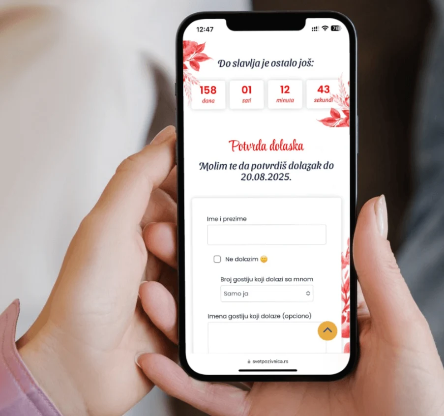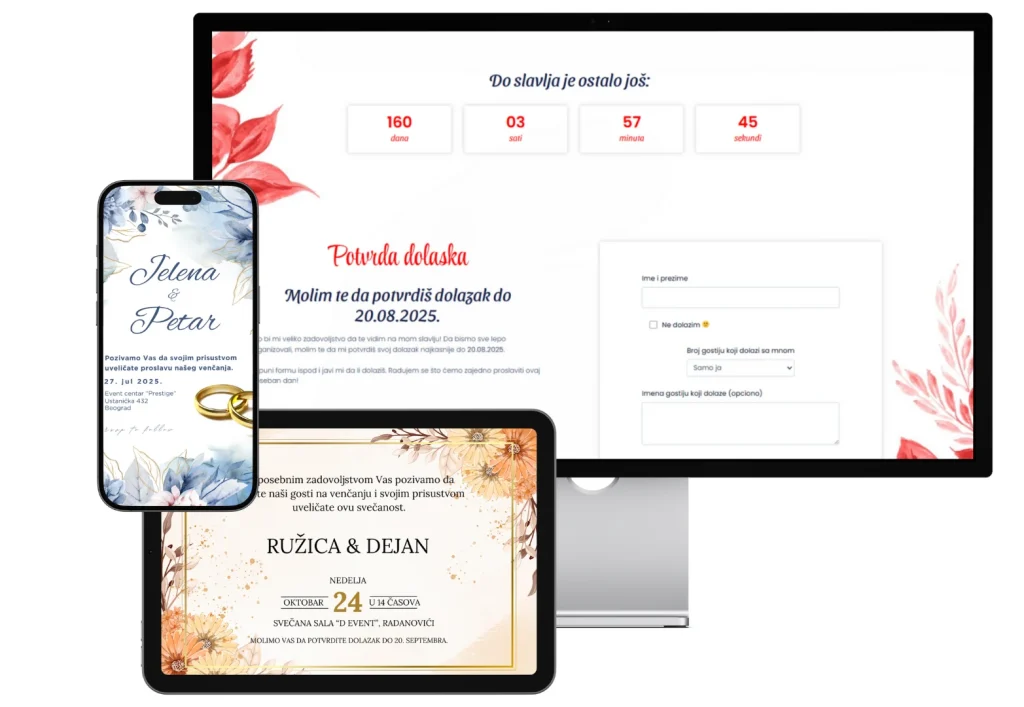 Naša digitalna pozivnica donosi više od lepog dizajna. Sa integrisanom RSVP formom, mapama, galerijom i interaktivnim sadržajem, omogućava vam da jednostavno komunicirate sa gostima i organizujete događaj bez stresa. Sve informacije na jednom mestu – dostupne svima, bilo kada i bilo gde!