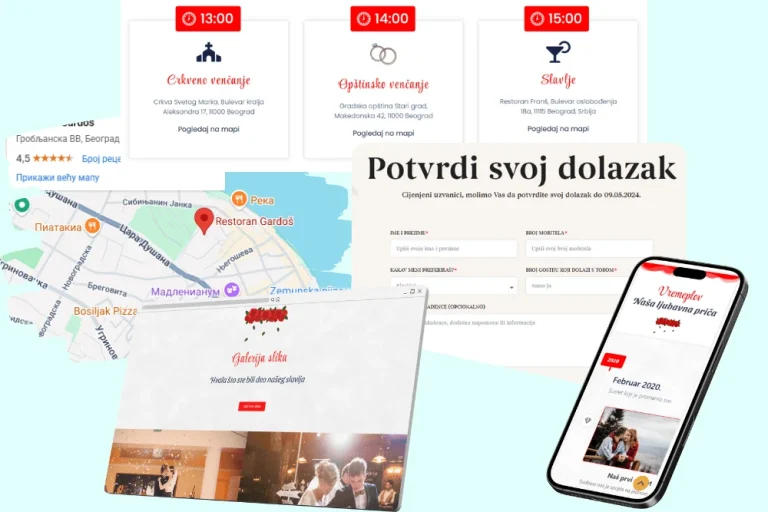 RSVP forma za potvrdu dolaska gostiju, mape, slike sa proslave, video sadržaj i još mnogo toga.